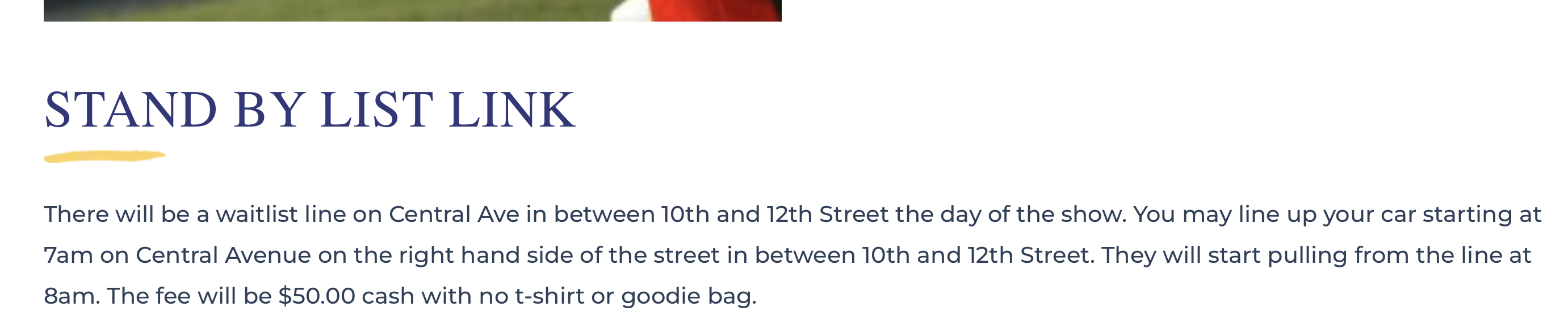 To register for the 2027 car show you can line up in the Hennessey's parking lot off of Central Ave between 7-7:30am on April 25th, 2026