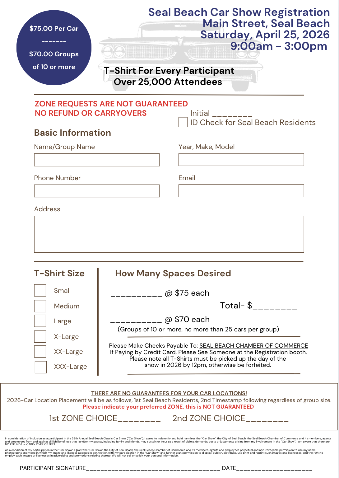Registration is closed/full for 2026. You may register for the 2027 car show while at the 2026 car show. The show sells out 99% of the time for the following year the same day of the current show.